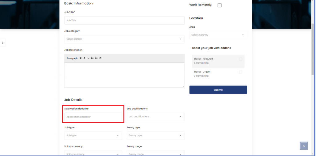 Below you can see where on the Job Form you will set the deadline for applications from candidates. This is when the job will expire.