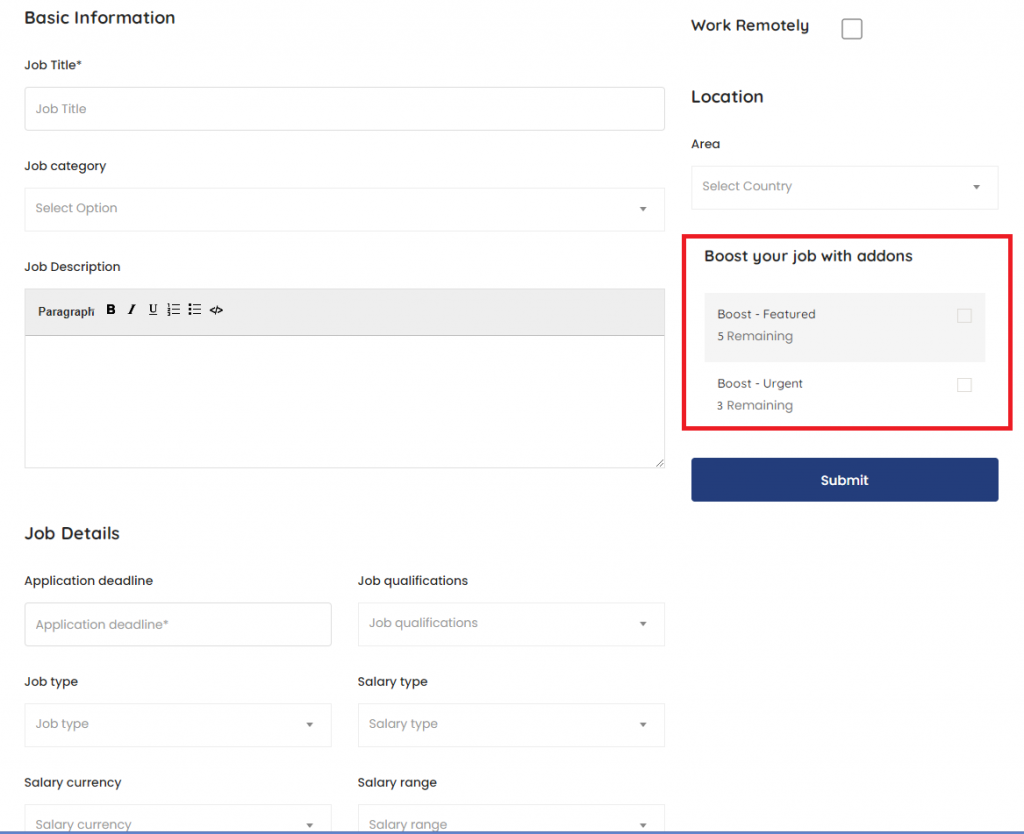 Once a package is purchased your are granted access to the Job Form where you can enter job details and submit for publication.